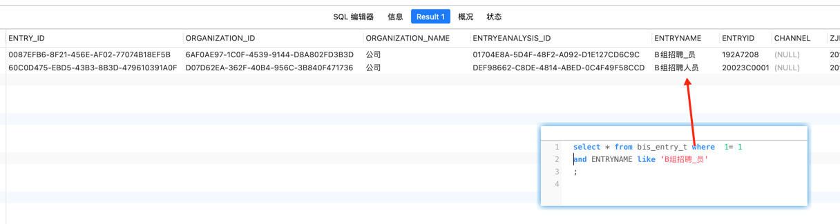如下图,entityname字段中有2条数据,分别是“B组招聘人员”和“B组招聘_员”,当前端传递“B组招聘_员”进行查询时,会将2条数据都查出来。