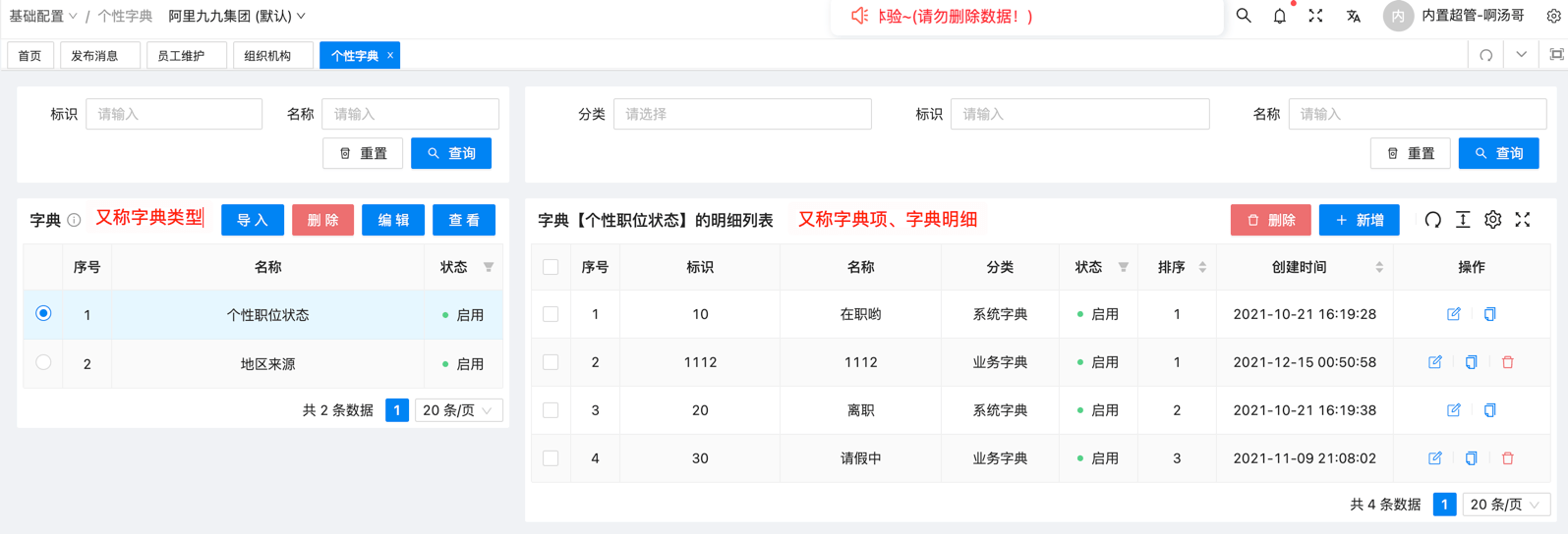 开发运营系统 -> 字典维护、系统字典和字典管理3个菜单数据都来源于同一张表 def_dict,只是UI层提供了3种布局方式; 基础平台 -> 个性字典操作的表是base_dict,又称租户字典。