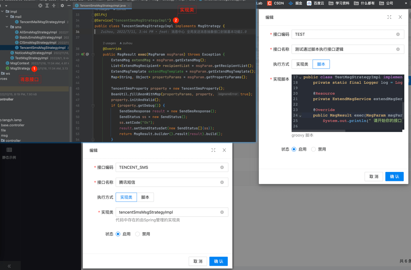 • 实现类:配置可以通过SpringUtils.getBean(implClass, MsgStrategy.class);方法获取的Java类,实现类必须实现MsgStrategy接口
