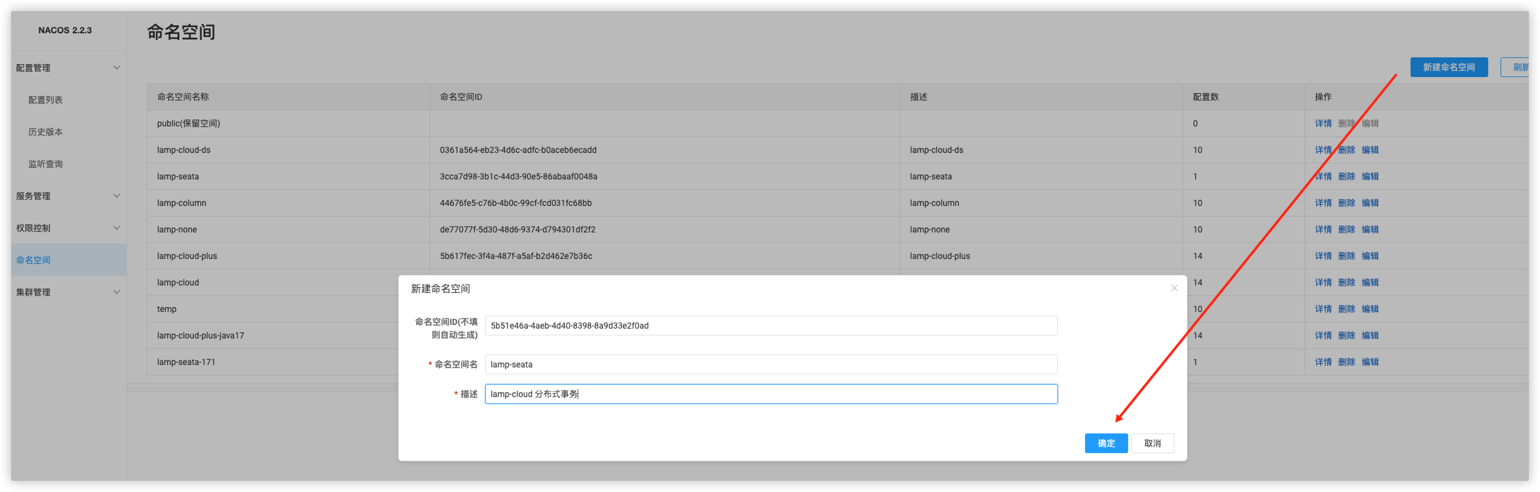 # seata service 信息 service.vgroupMapping.lamp_cloud_seata_tx_group=default service.default.grouplist=192.168.1.190:8091 # 数据库信息 store.db.dbType=mysql store.db.driverClassName=com.mysql.cj.jdbc.Driver store.db.url=jdbc:mysql://172.26.3.32:3306/lamp_seata?useUnicode=true&rewriteBatchedStatements=true store.db.user=root store.db.password=root # 修改序列化方式, 使seata支持LocalDateTime字段 client.undo.logSerialization=protostuff在naocs中新建命名空间
