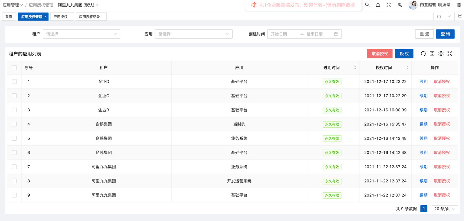 • 企业(租户)创建成功后,会自动给企业授予基础平台应用,其他应用需要自行授权。