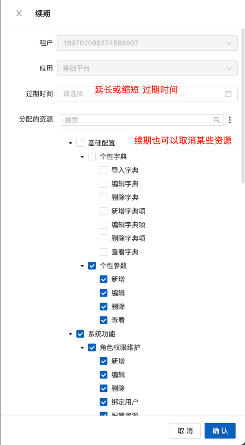 2. 续期:这里的续期并不只是延长时间,而是对某次授权过期时间和资源进行调整,可以延长也可以缩短过期时间,可以新增资源也可以减少资源。