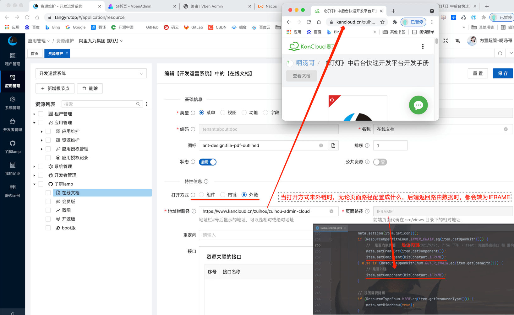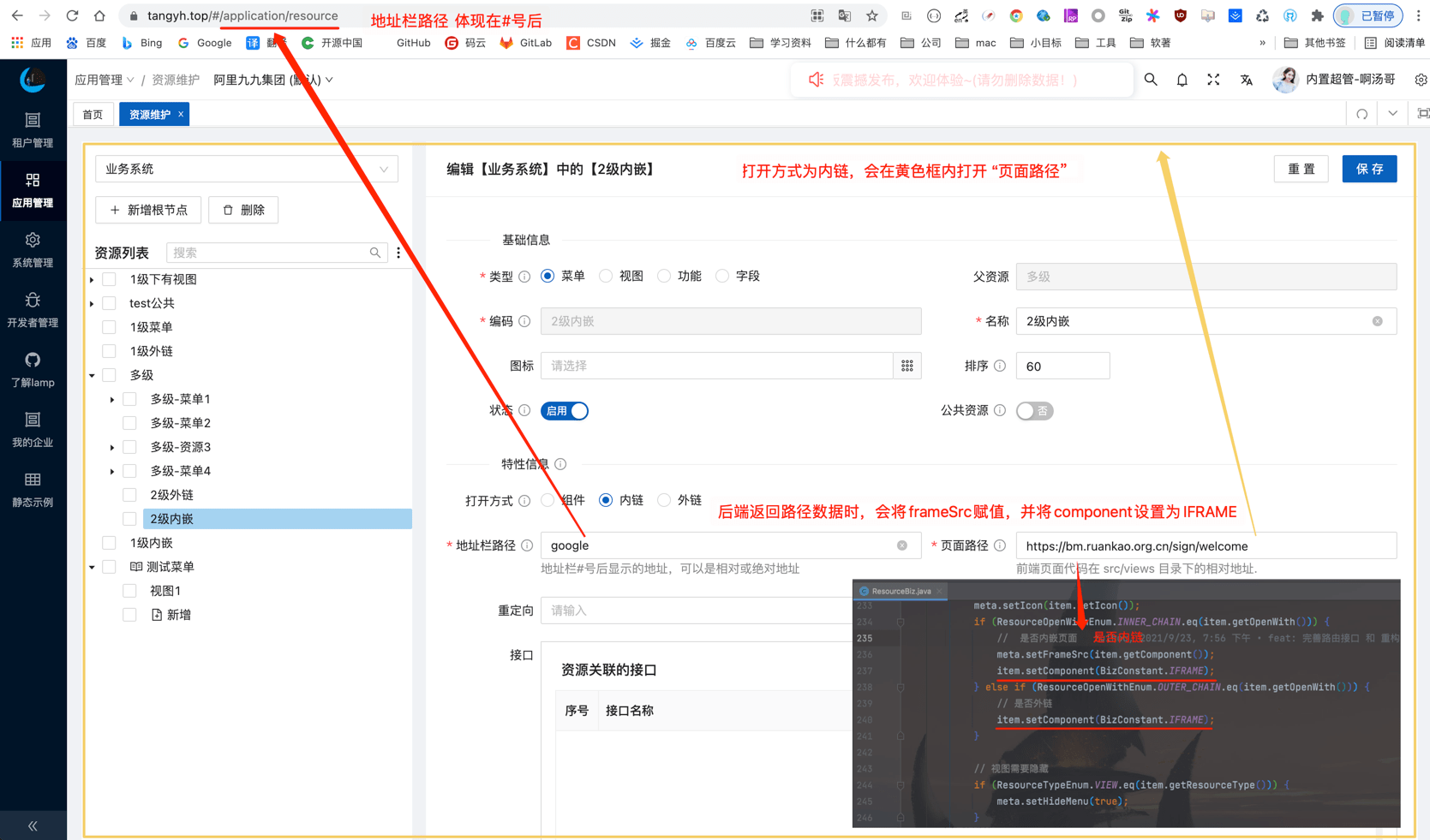 - IFRAME:当前菜单是外链时,可以将component配置为IFRAME。当菜单为内链时,将path地址配置为路由地址,同时将component配置为http链接,后台在返回路由信息时,会自动将frameSrc参数赋值,同时将component字段设置为IFRAME 。