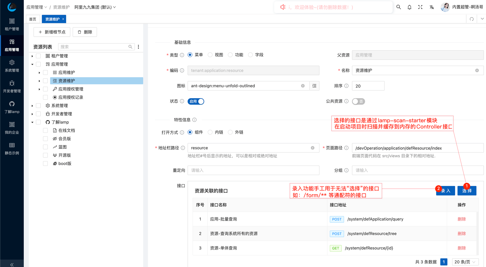 在代码中增加、修改或删除Controller层接口(API、URI)后,需要重启服务,才能在资源关联的接口被正常选择。