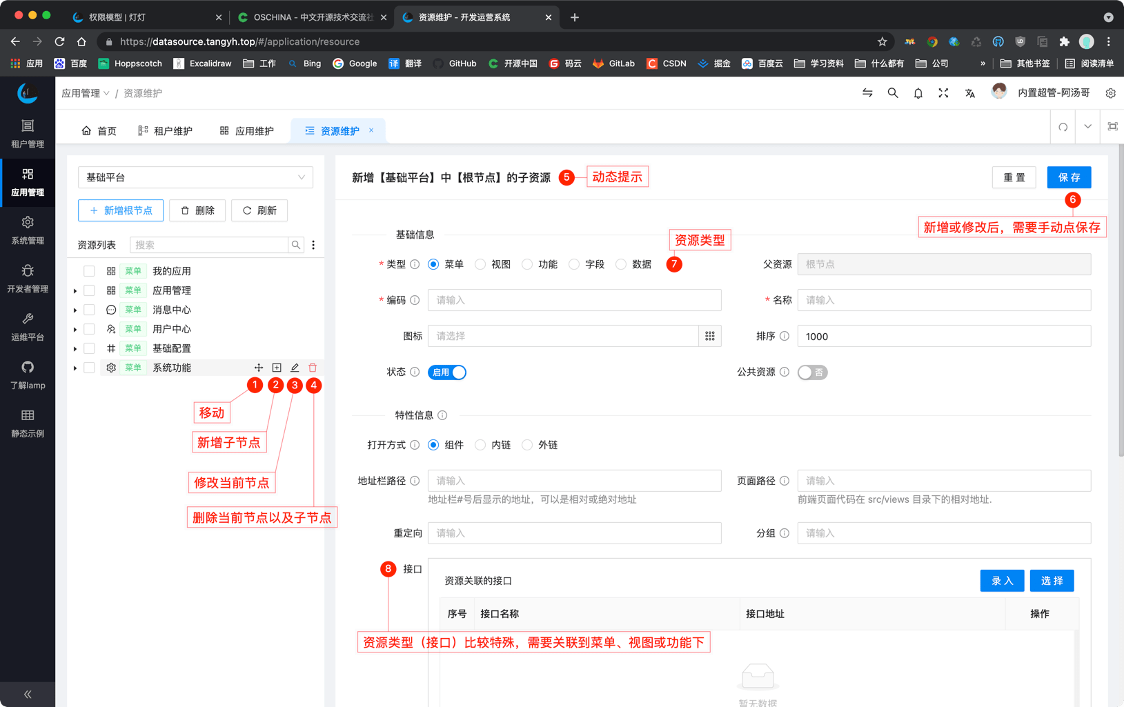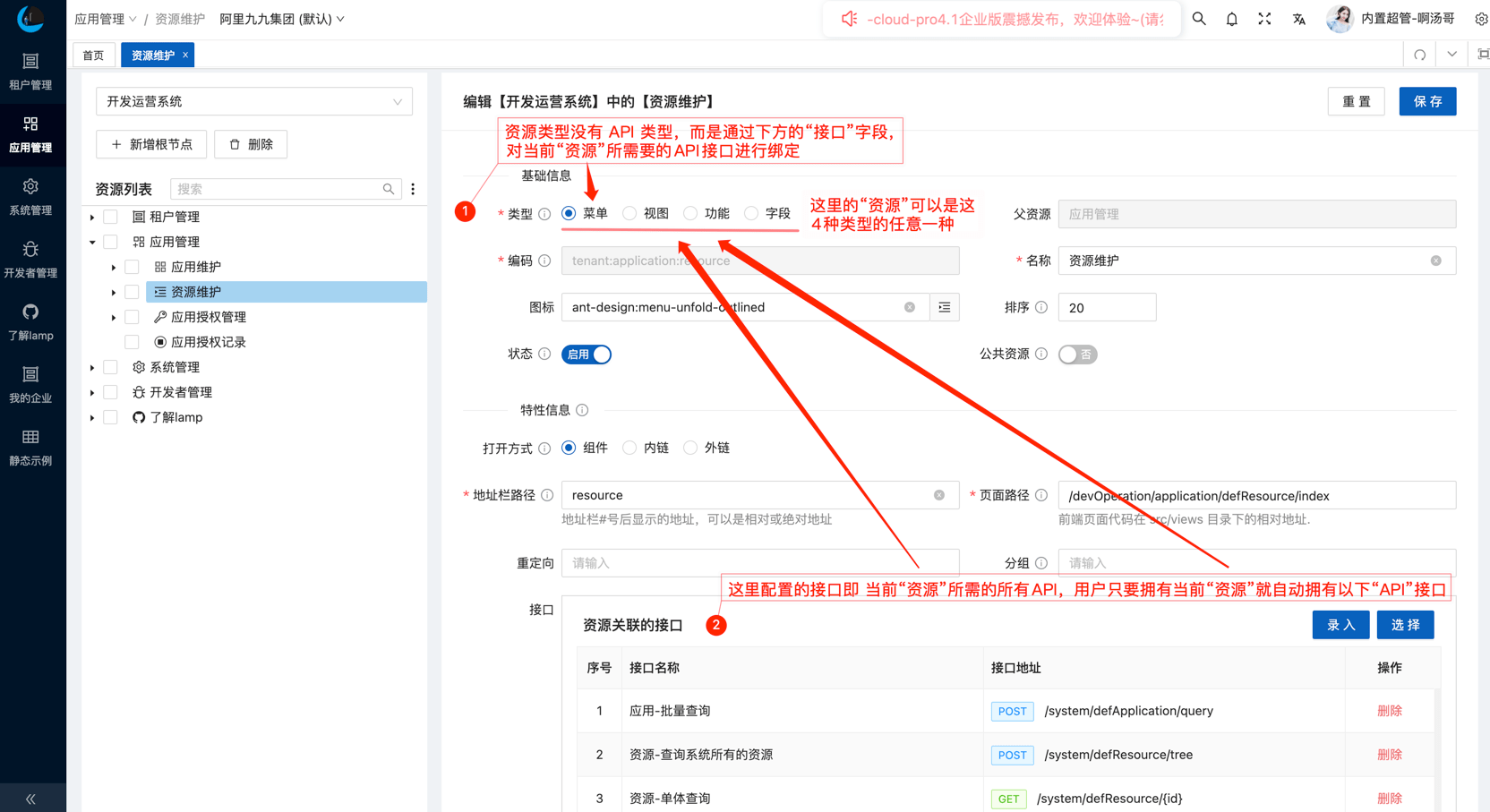 接口:又名API、URI。接口类型并没有在界面上体现出来,体现在接口字段上,是可以关联到任意一种资源,只要授权了资源,便可访问此接口。接口权限由后端控制。