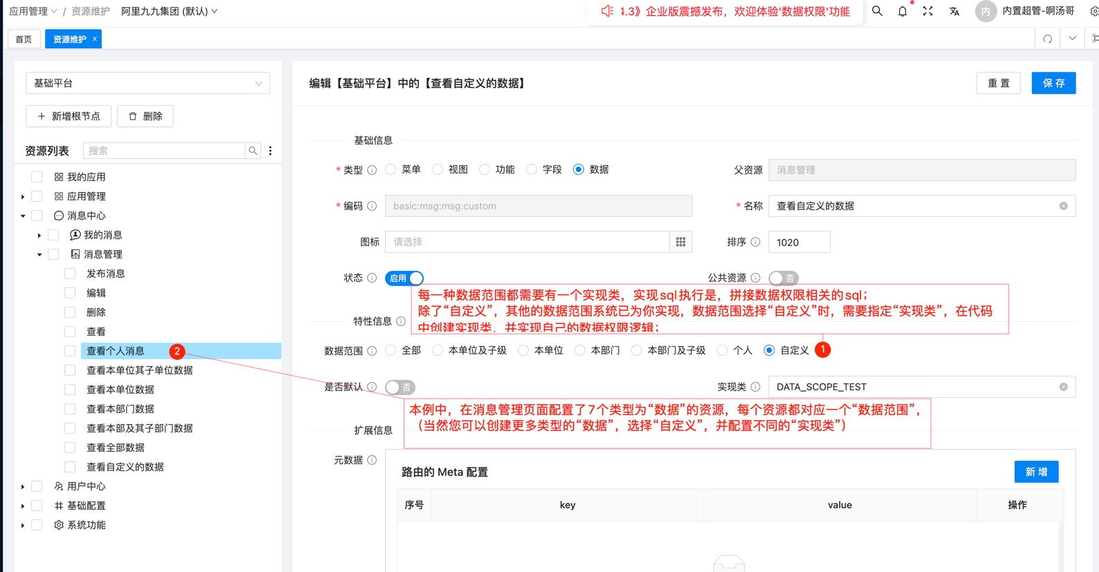 数据:数据权限,数据权限只能配置在菜单或视图下级,比如可以在菜单"消息管理"下配置"数据",要配置几个数据资源,完全取决于你们的业务需要控制控制“消息管理”的数据。如,你只想控制查询本人、查询本单位、查询全部数据3个维度,则只需要在“消息管理”下配置3个“数据”资源。