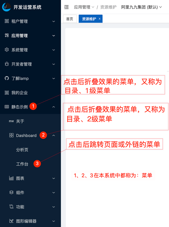 应用:之前有考虑过把应用也当做一种资源,但最终将应用独立出来在应用维护和应用授权管理实现。菜单:即系统左侧显示的菜单,不管是1级、2级还是N级菜单,点击之后是折叠效果(有些系统层折叠菜单为目录)还是跳转页面,在本系统都统称为菜单。