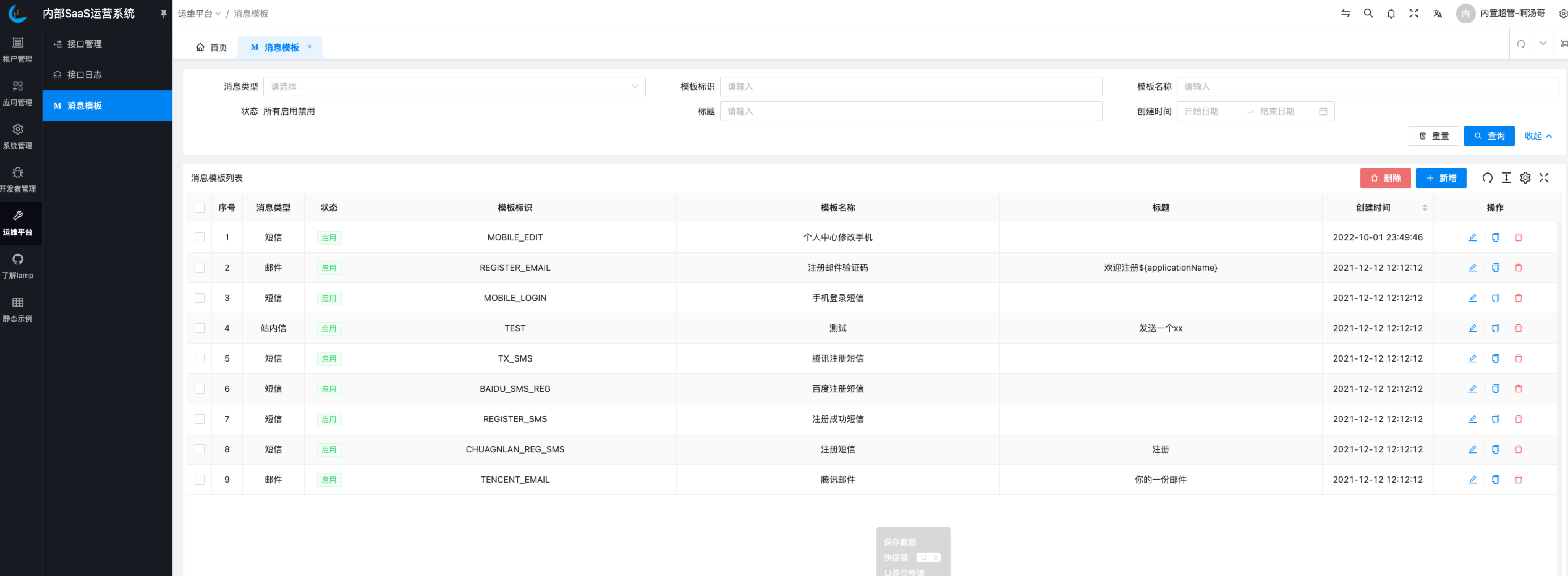 消息模板依赖于接口管理,意思是在定义消息模板时,就必须确定该模板需要通过什么接口进行发送,若一个业务需要同时发送短信、邮件、站内信通知,则需要配置3个模板,并绑定3个接口