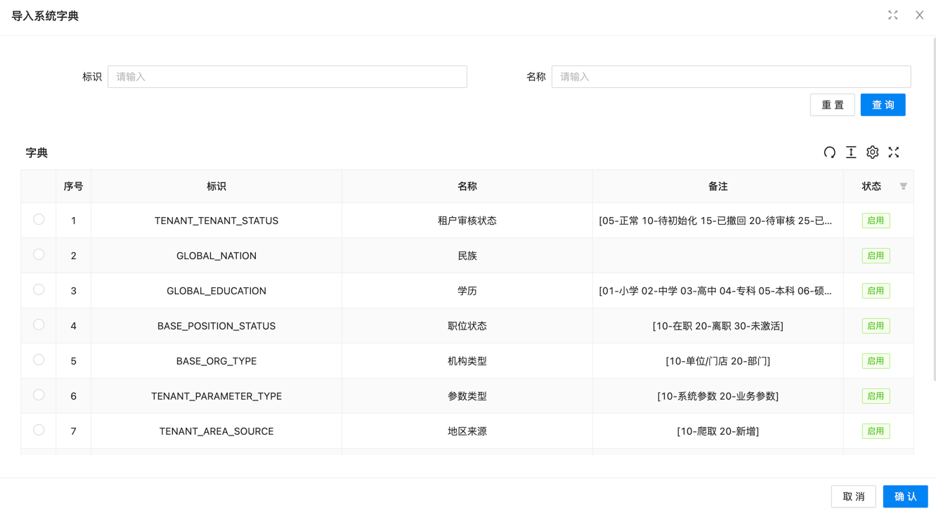 导入流程:将def_dict表中的字典和字典项数据,复制到base_dict表中,租户在查询字典数据时,会先查询自己的租户库base_dict表有无字典数据,若自己有数据,则取自己的;自己没数据,就取def_dict表的数据。