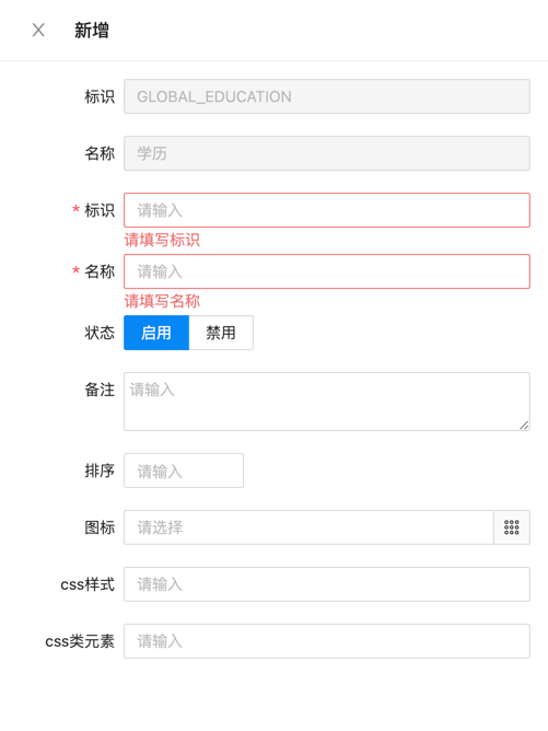 新增字典项:选择左侧的字典,待右侧字典项加载完毕后,点击右侧字典项表格上方的新增按钮,弹出新增框,新增系统字典项。字典项标识需要全局唯一。新增字典项时,会将字典项的parent_id存储为归属字典的id。