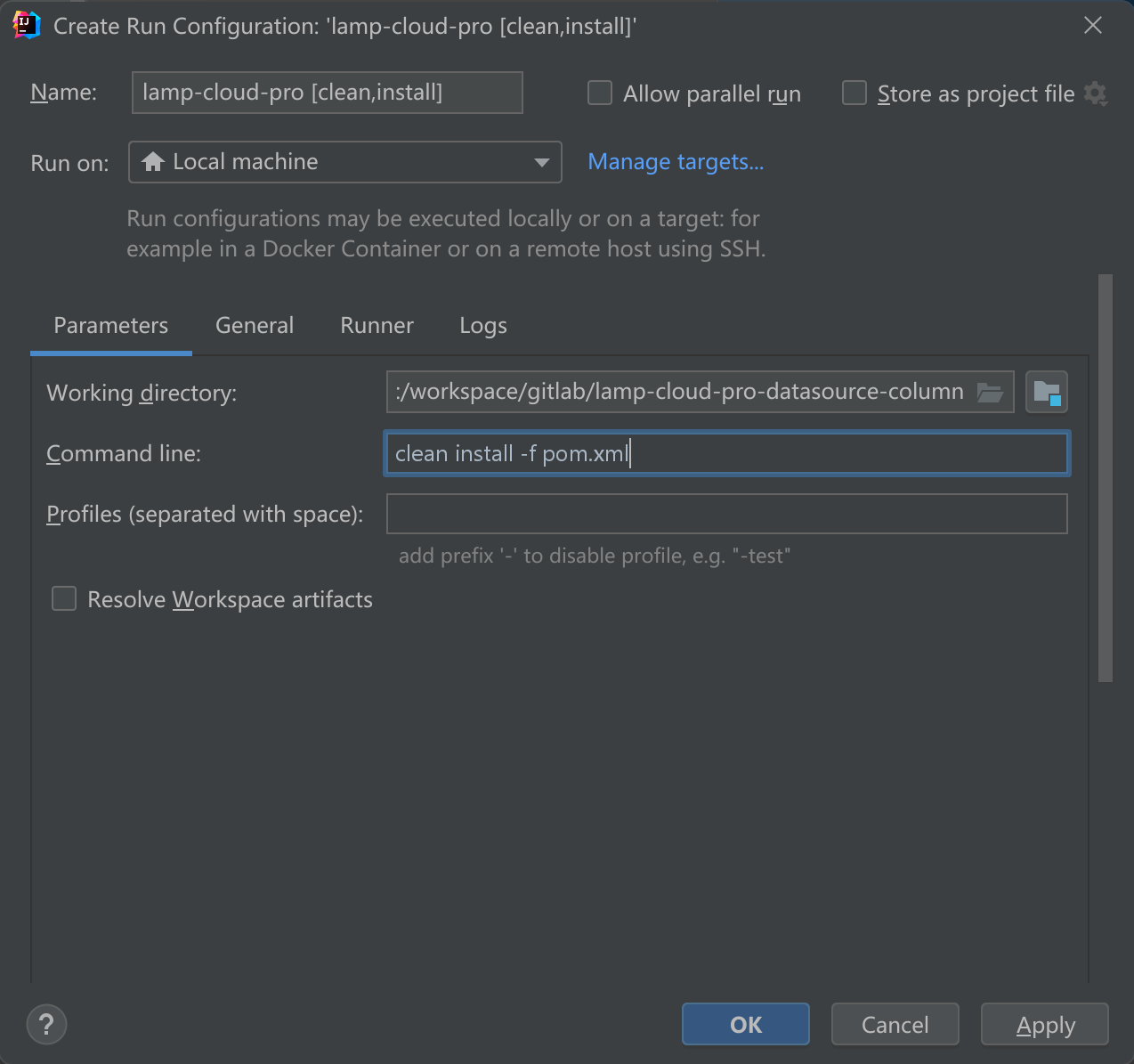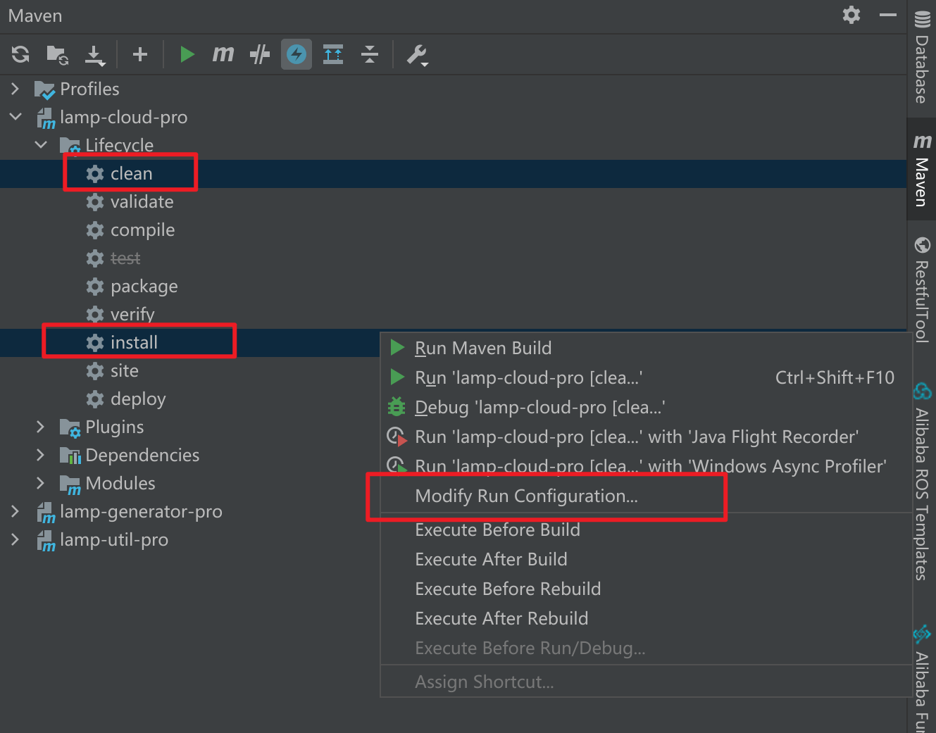 lamp-datasource-max项目编译命令: 展开Maven面板,选中Toggle 'Skip Tests' Mode,按着Ctrl键同时选中clean 和 install -> 点击鼠标右键-> 在展开的菜单中点击Modify Run Configuration-> 弹出框中输入下面的命令, 然后点击弹出框的Apply按钮保存设置clean install -DskipTests=true -f pom.xml