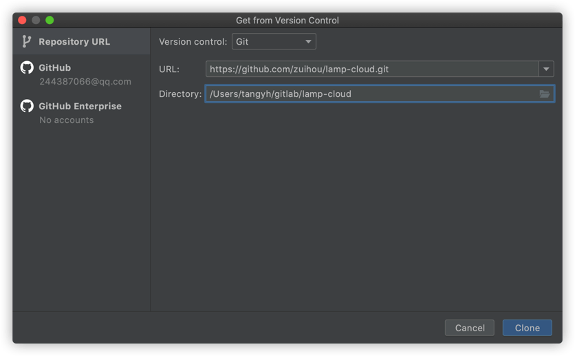IntelliJ IDEA,依次选择:Git -> Clone ,Version control处选择Git, URL 填写上面的git地址, Directory 填写本地存储代码的绝对路径注意