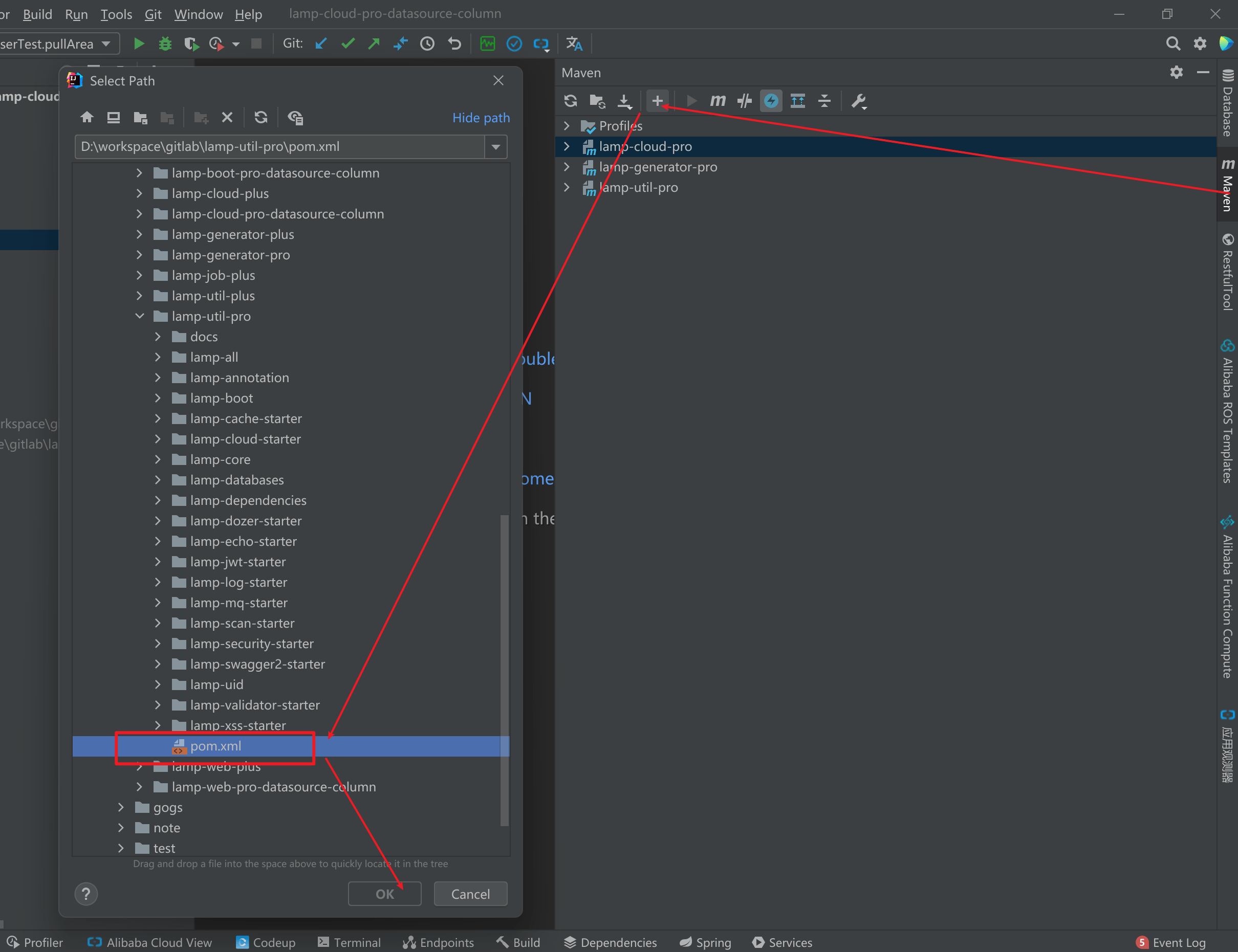 lamp-util-max项目导入lamp-datasource-max项目所在的同一个工作空间: 点击Maven ->Add Maven Projects-> 在弹出的对话框 lamp-util 项目的根pom文件
