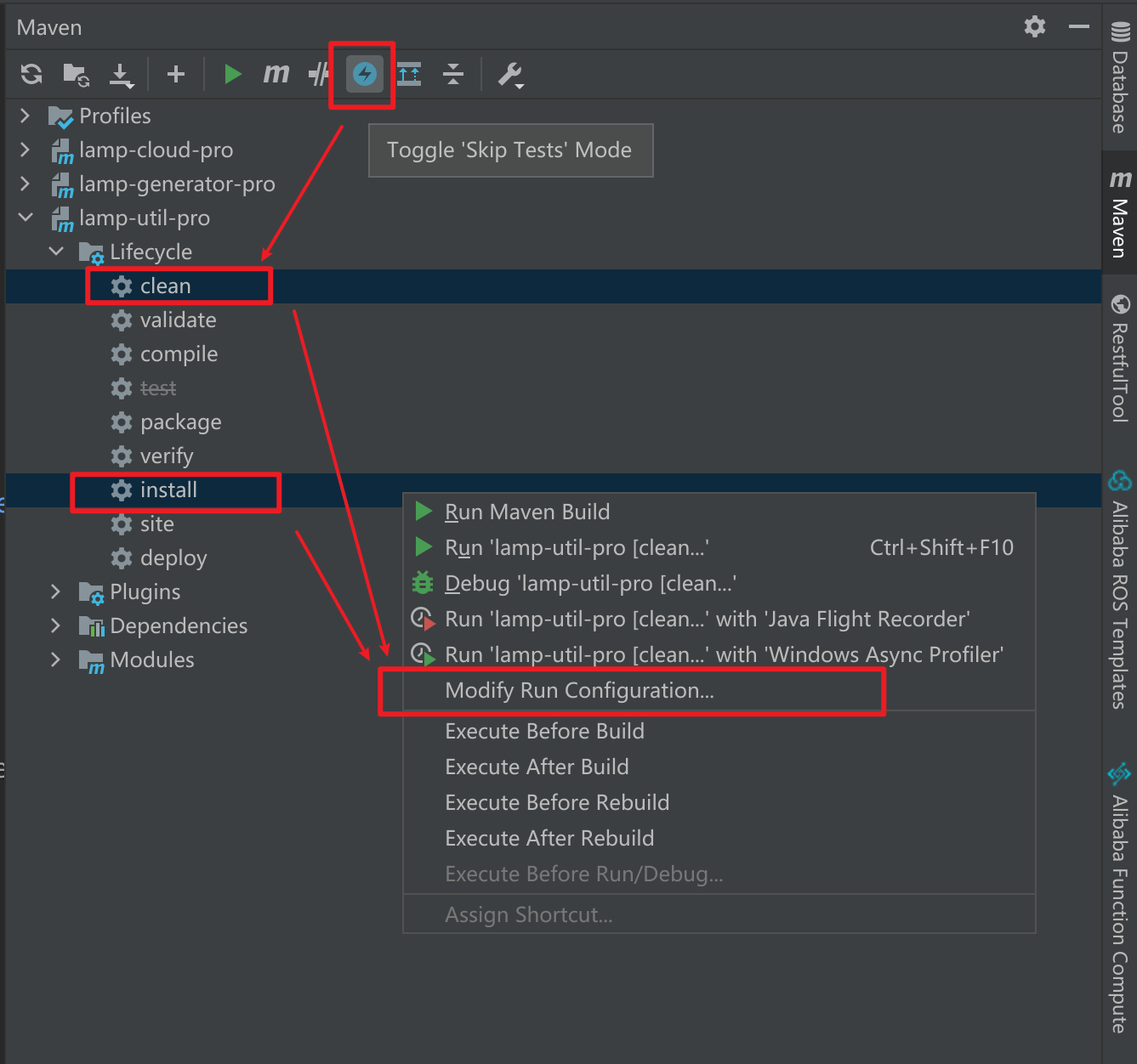 lamp-util-max项目编译命令: 展开Maven面板,选中Toggle 'Skip Tests' Mode,按着Ctrl键同时选中clean 和 install -> 点击鼠标右键-> 在展开的菜单中点击Modify Run Configuration-> 弹出框中输入下面的命令, 然后点击弹出框的Apply按钮保存设置clean install -Dmaven.javadoc.skip=true -Dgpg.skip=true -Dmaven.source.skip=true -DskipTests=true -f pom.xml