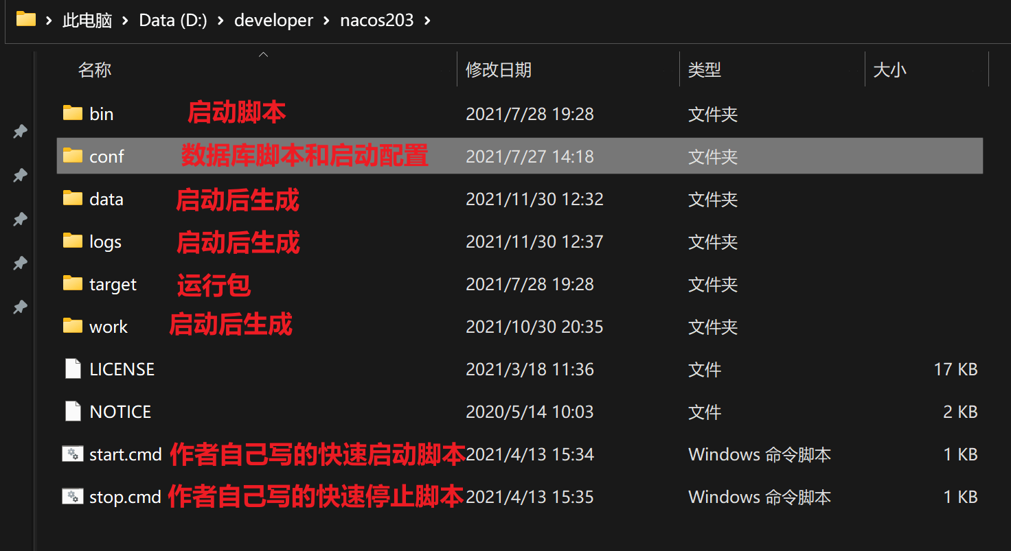 - 从官网下载官方安装包 您可以从 最新稳定版本 下载nacos-server-xxx.zip包,解压到 D:\developer\nacos