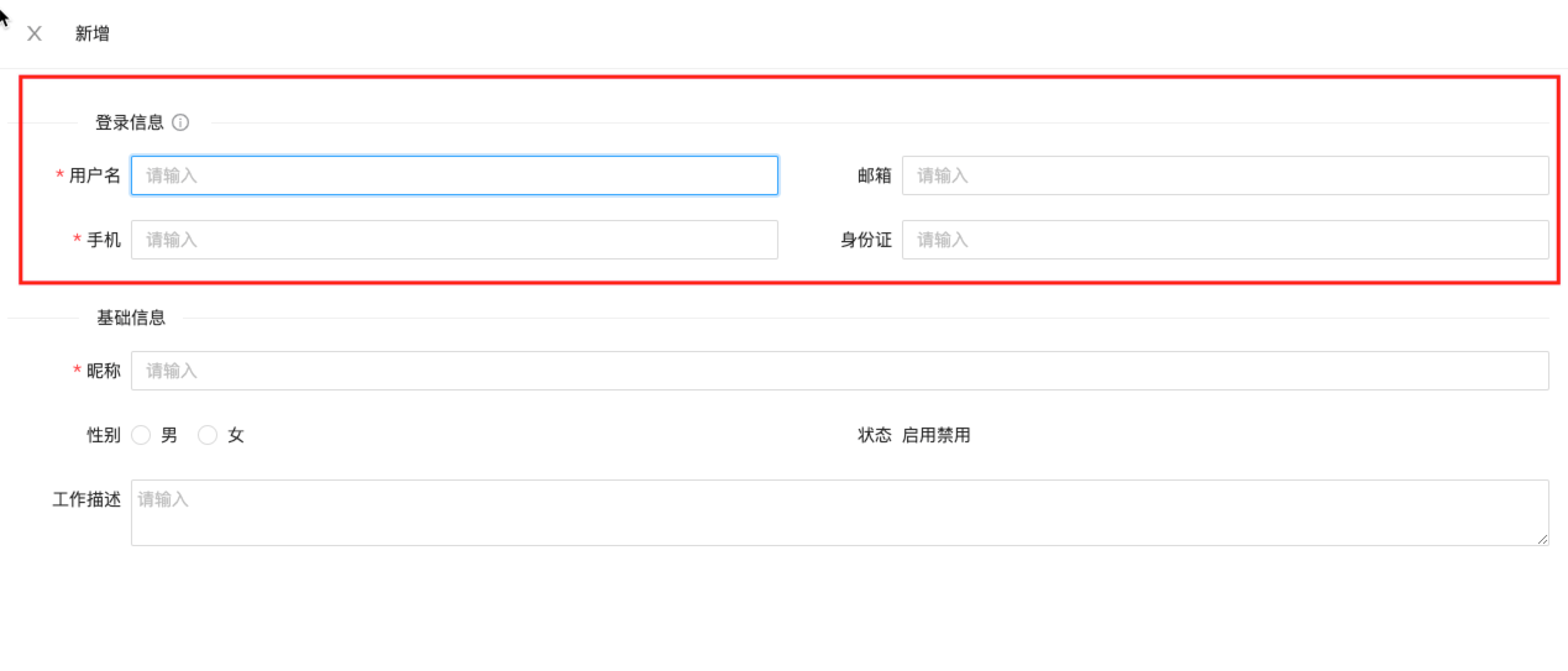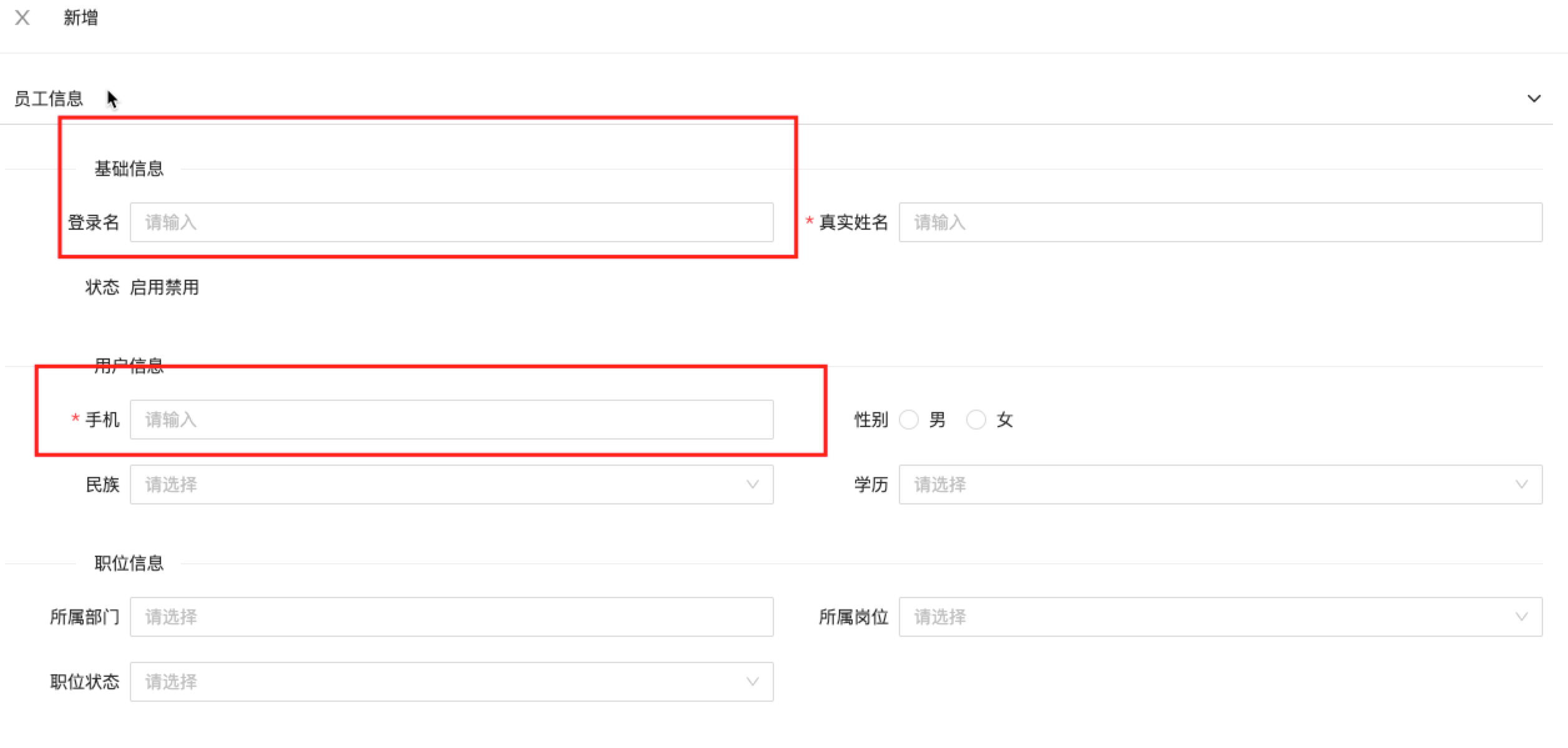 在基础平台-用户中心-员工维护页面创建员工时,填写的登录名、手机可以作为登录账号。登录名是非必填,若不填,系统会生成一个随机字符串作为登录账号。