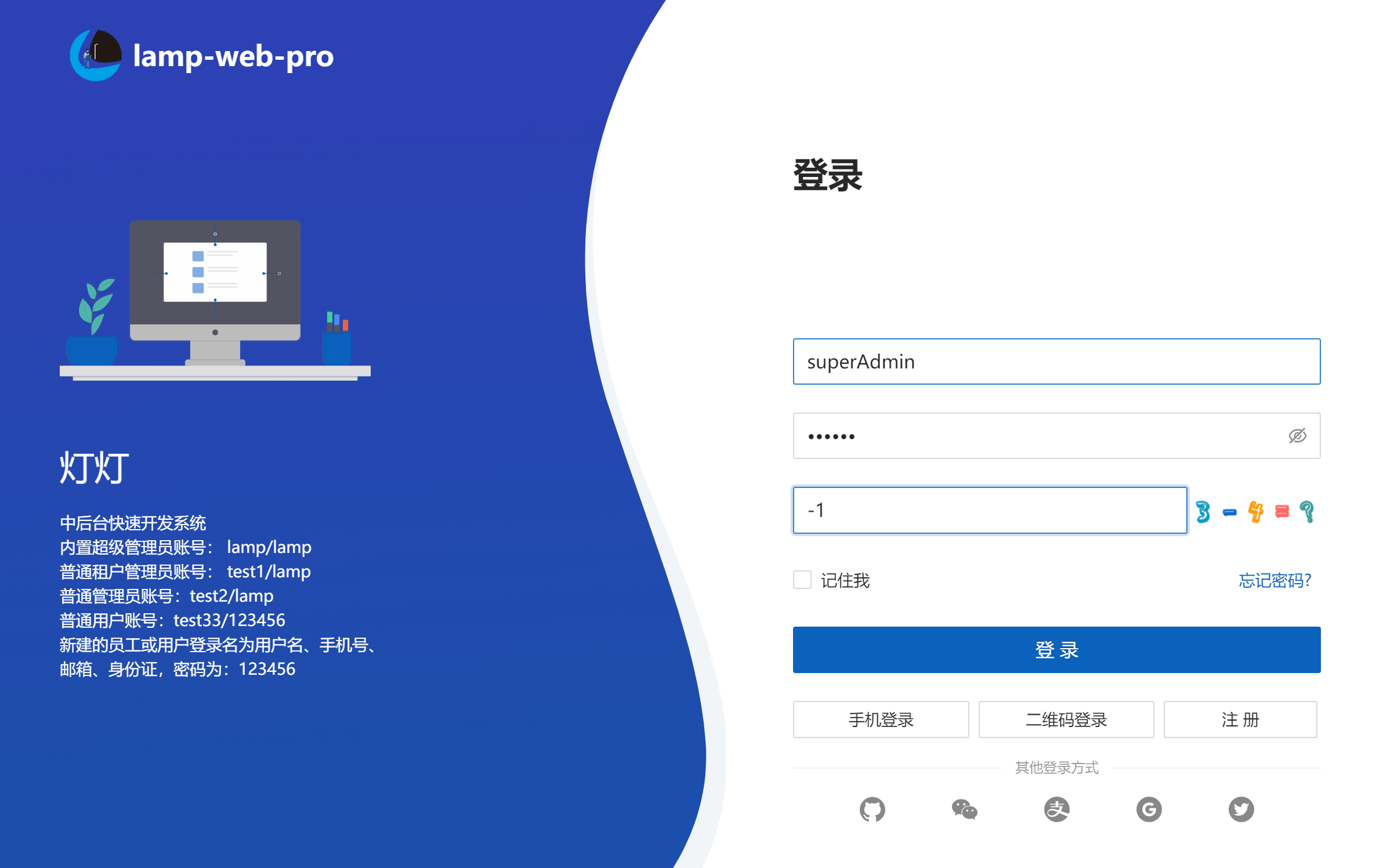 登录页左侧展示了演示环境中存在的账号和密码,提供给大家体验时使用。二次开发时,除了保留lamp账号,其他账号可以删除。