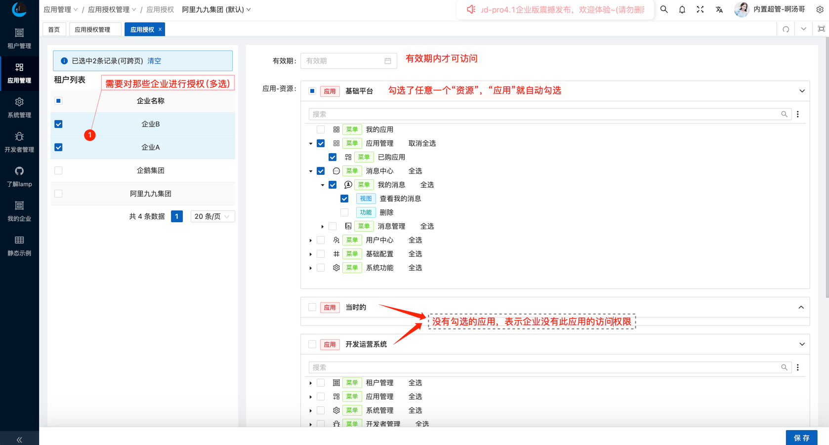 - 企业(租户)创建成功后,会自动给企业授予基础平台应用,其他应用需要自行授权。